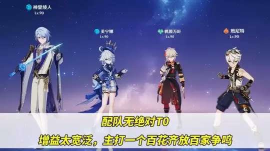目前还没有出现绝对的T0配队方案,因为增益机制太过宽泛了,很难分出绝对的T0队。现在有很多选择,比如芙宁娜、心芙万夜、影芙夜琴等等。每个玩家心中的判断标准不一样,会侧重增益利用率、队伍的安逸度和外观,特别是在现在强度焦虑基本为0的时代。