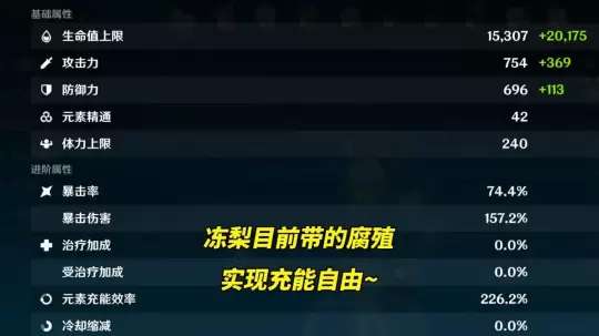 充能武器中,灰河渡手有17%的选择率,腐殖之剑有13.4%的选择率,西风剑有11.3%的选择率,这三种武器都是4星优选。因为就词条而言,这些充能武器的性价比对于芙宁娜来说远远超过大部分五星单手剑。冻梨本人也使用腐殖之剑,因为它具有充能增伤和暴击效果,非常实用。