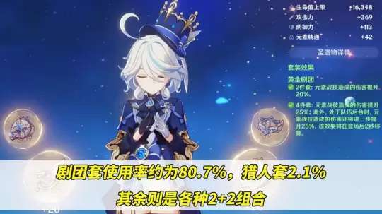 看来在圣遗物方面,玩家已经从稻妻和须弥的"教训"中吸取了教训,对于枫丹首个圣遗物秘境的挑战投入了很多时间和精力。目前,剧团套的使用率约为80.7%,猎人套的使用率为2.1%,其余则是各种2+2组合(充能、生命值、水伤)。其中使用猎人套的玩家,大部分都是满芙玩家在扮演站场主C的角色。