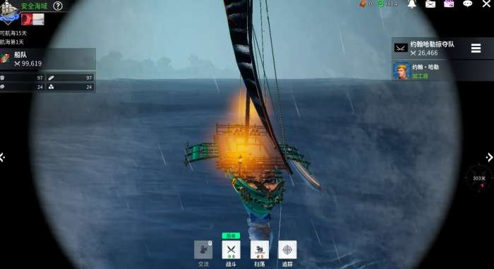 首先,大家在航海的时候,如果视野中有敌舰,你就可以点一下船只,这个时候就会进入观察模式了,我们可以看看敌舰的基本信息。这些信息能够让我们判断敌舰的实力,也知道自己有没有胜算。看到之后,点一下战斗按钮,就能够宣战了,准备开始战斗了。你可以选择一些敌对命令,像交涉、战斗和追踪这些,来决定怎么去对付敌舰。