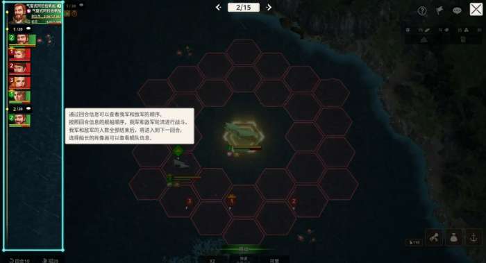 战斗正式开始之后,系统会把你带到一个专属的战斗地图,这就会是你和敌舰对决的地方,这个地方有六角形的格子,舰队和敌舰会分别站在不同的位置,进行回合制的对决。每个回合顺序是根据舰队的机动力来决定的,大家可以在画面上方看到行动的顺序。过程中,船员的战斗效果也会自动触发,越多相同效果的船员,效果越强。大家可以通过菜单查看这些效果,看看怎么去赢得战斗。