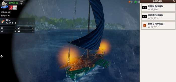 除了普通攻击,战斗还可以通过炮击、白刃战、冲破和决斗等方式进行。敌方船只的耐久度降到零,或者船员全都被消灭,又或者是你和敌舰的船长进行一对一的决斗,然后获胜了,都会让对方沉没。当敌方所有船都沉没时,你就胜利了。如果你使用炮击或者是白刃攻击的时候,自己的船只若是能够配合得好,还可以触发“夹击”机制,这个时候你用多艘船同时攻击敌方,就能打出更秀的伤害。