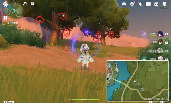 2,首先可以来到蒙德城东边传送锚点,再向东边走一点,两个树下,7个日落果