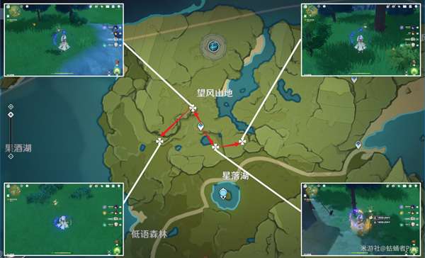 2,然后来到望风山地的传送锚点,如图示,有四处较近的点位产出落落莓,可以去拍摄一下