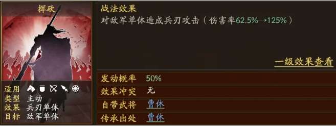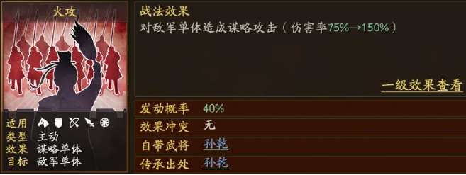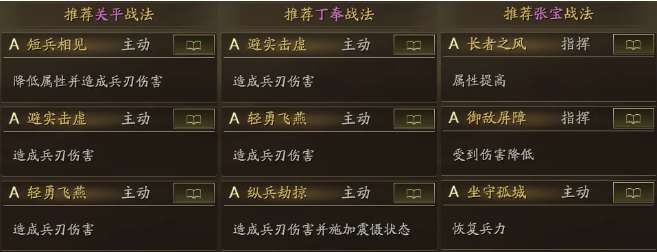 对于0氪低氪的朋友来说,初入游戏是比较难获得战法的,建议直接B战法走起过渡。这里建议2个B级战法用来补充输出,挥砍给兵刃武将使用,火攻给谋士武将使用。