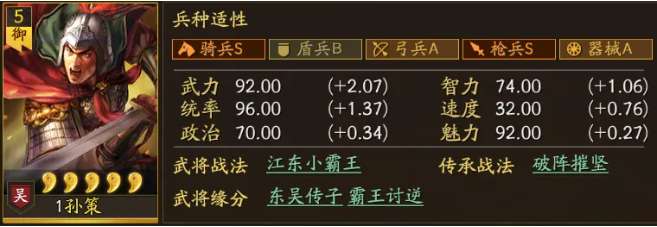 除了孙坚,孙策的入手门槛也不高,也可以跟孙坚组合在一起进行开荒。孙策比起关平,则拥有更好的属性、战法,也能跟孙坚组成,骑枪双A以上适性进行作战。