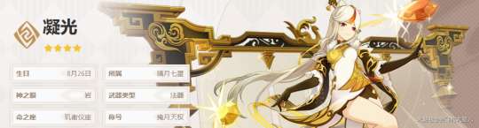 第二个角色是“凝光”。这姐们是个岩系主C,璃月四星三大主C之一,开荒非常好用的角色之一。