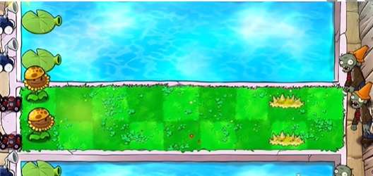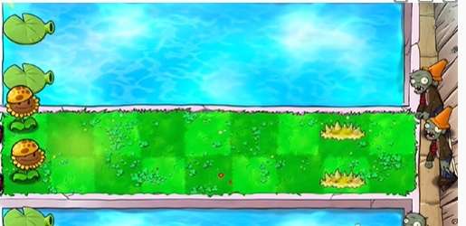 2、先在最里面一侧建造一排豌豆睡莲,在草坪上建造两个向日葵,然后在靠前的草坪上种植两个地刺。