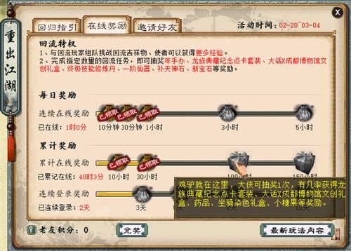 活动期间,玩家点击左上角“重出江湖”按钮,即可开始“召回老友”,当玩家召回活跃度达到500、1500、3000、5000即可进行抽奖,年手办、龙族典藏纪念点卡套装、大话主角手办、神兵均有机会获得!
