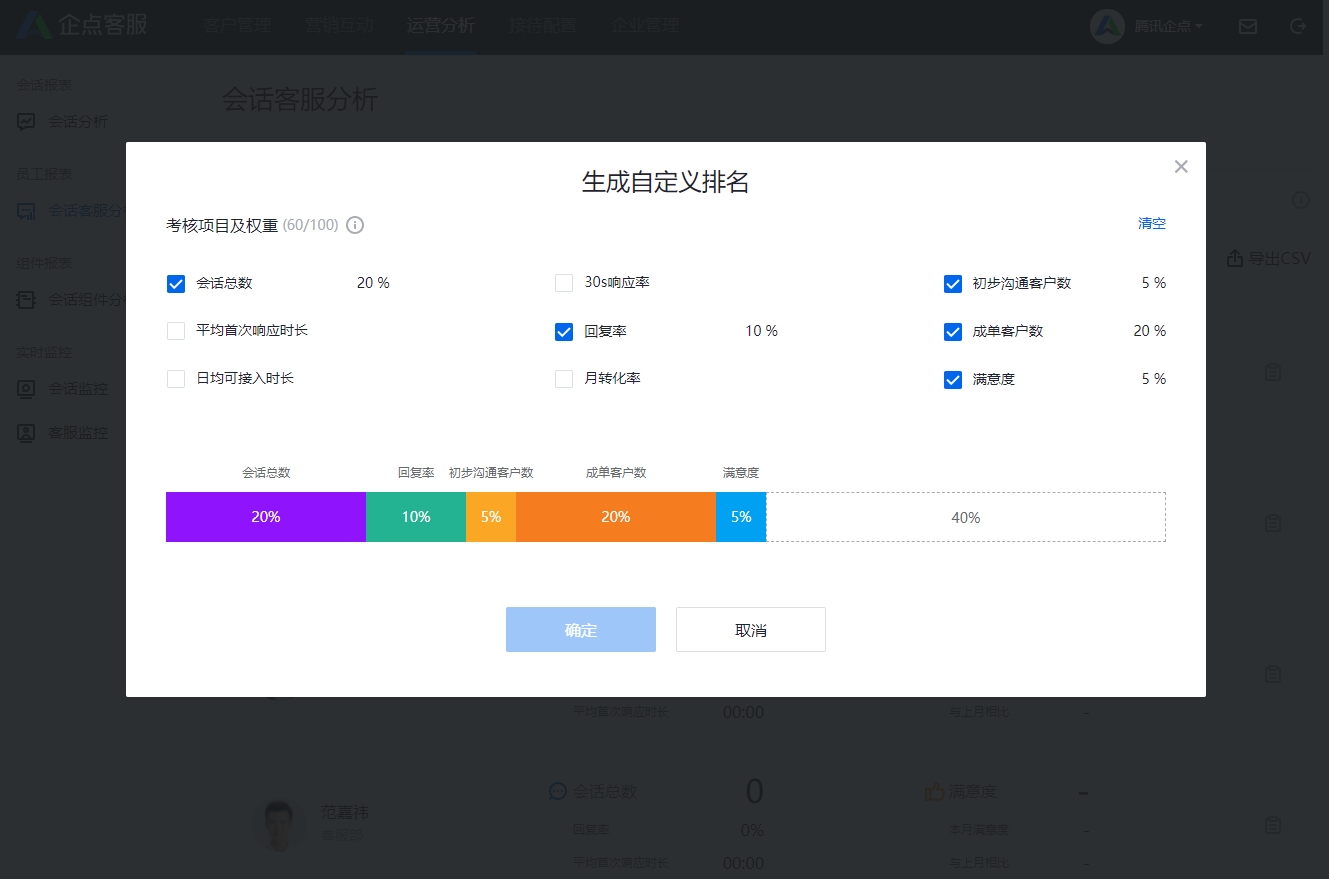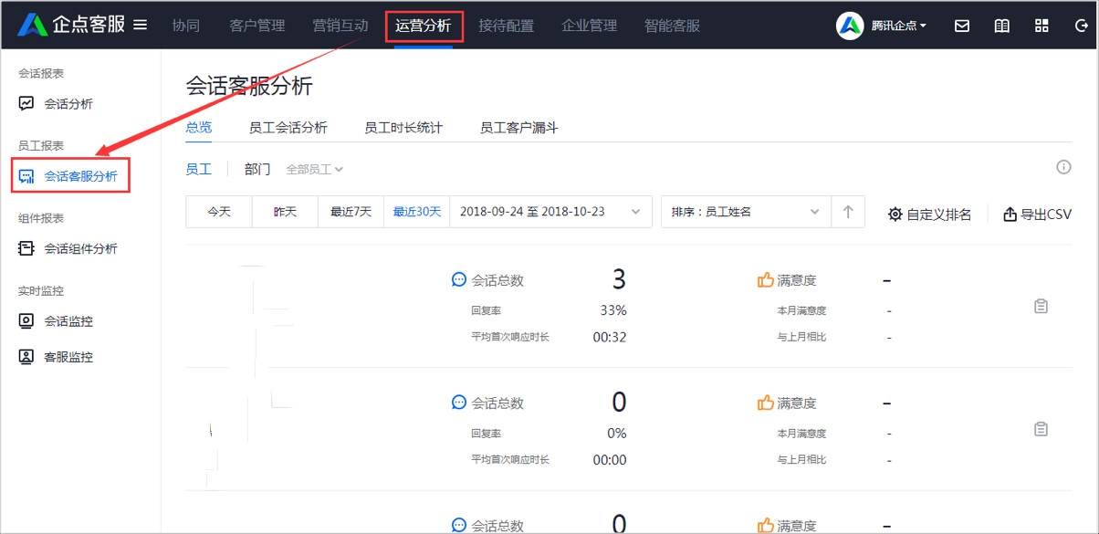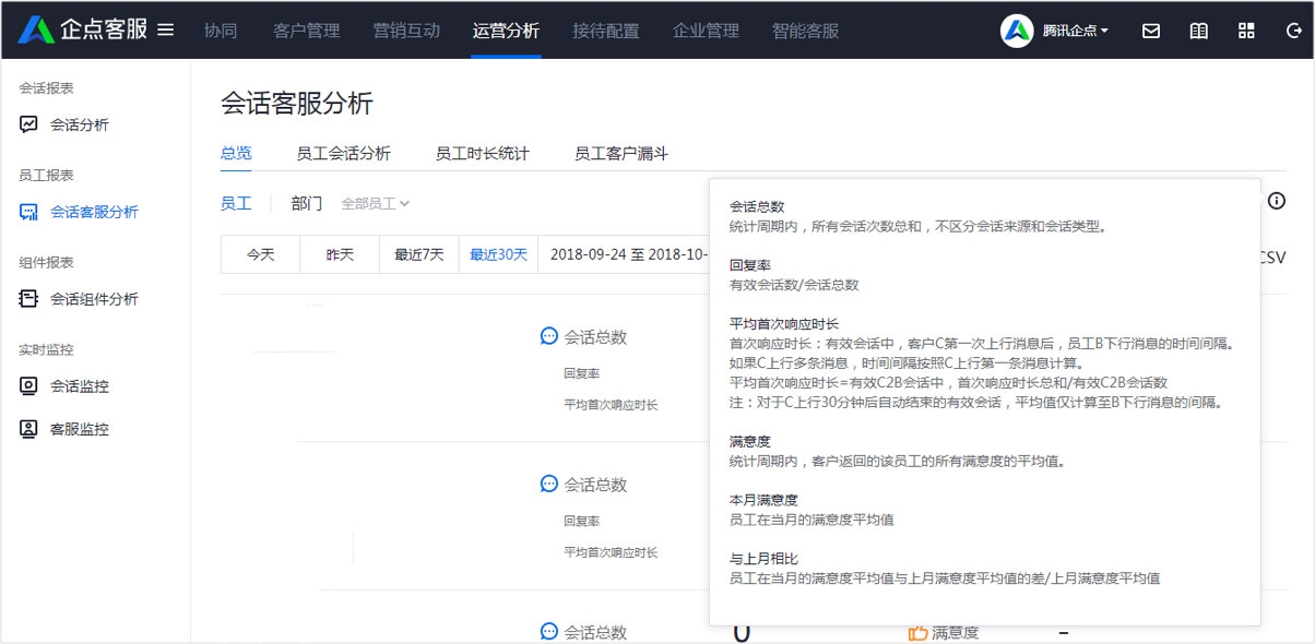1、下载腾讯企点,可以通过本页面上方的链接点击进入下载。打开腾讯企点,在总览页面,企业能分别查看员工、部门的会话接待情况及满意度,同时设置一键导出CSV按钮,方便数据的导出引用。