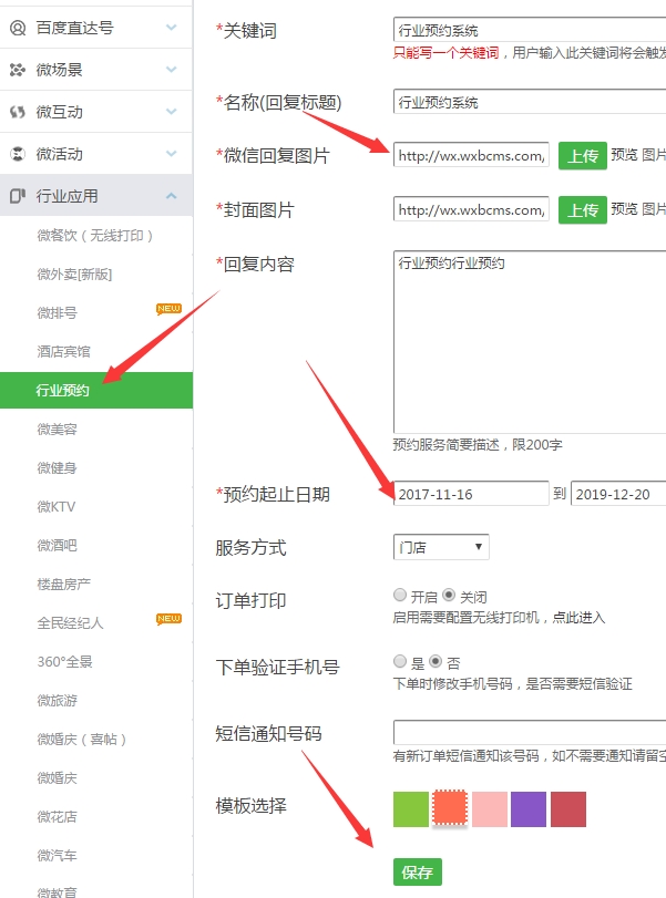完成后再到行业应用里添加行业预约,并且平台上是允许同时创建多个预约活动,勾选好预约的起止日期还有服务方式,选择模版颜色,点击保存。
