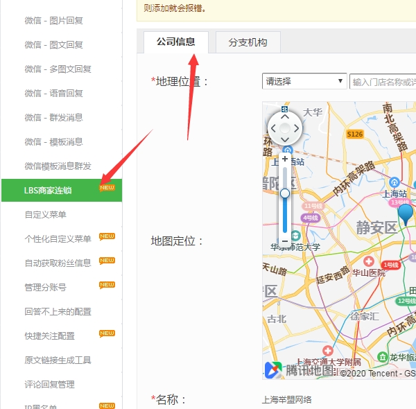 进入到功能后,点击基础设置里LBS商家连锁按钮,根据你的需求,添加自己的门店信息,位置以及联系方式等,