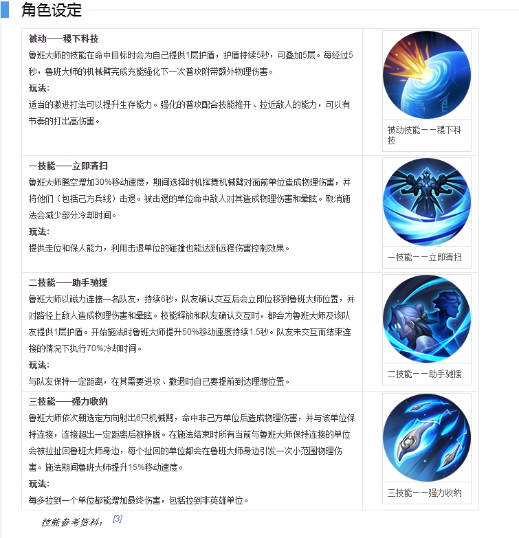 使用技巧当你使用该英雄时:注意配合为队友创造有效位移。利用一三技能连协控制敌人位置。对手使用该英雄时:注意鲁班大师附近的队友,他们可能会立即到达鲁班大师的位置。注意用控制技能打断鲁班大师。