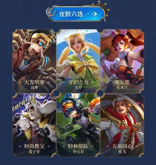 6款皮肤免费得其一:守护之力、五福同心、兔女郎、时尚教父、特种部队、大发明家。