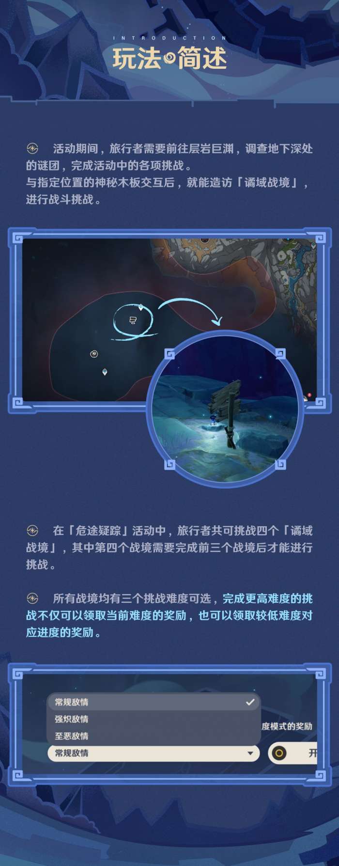 软件提交 专题合集 热门手游《原神》危途疑踪活动是游戏中新版本更新之后上线的全新活动,在本次活动中玩家将会深入调查层岩巨渊中的情况,可能有玩家还不清楚这次的活动要怎么玩,下面小编就给大家整理了具体的活动玩法说明,一起来看看吧!