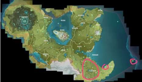65.摘星崖东侧海中(我是凯亚E技能一路冰过去的,不然就制作体力食物游过去),吹风上去即可,路线门口,右边,中间