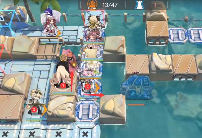 部署群奶(向上)→ 第三个术师(向右),最后部署一个挡0工具人如图所示位置吸引法师仇恨。