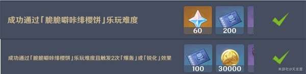 2、成功通过[脆脆噼咔绯樱饼]乐玩难度且触发2次[爆轰]或[锐化]效果