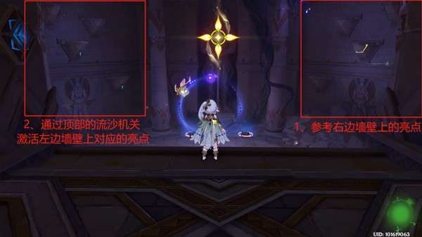 参考右边墙壁上的亮光点(金色),点亮对应左边墙壁上的沙池。一共有三次解密。