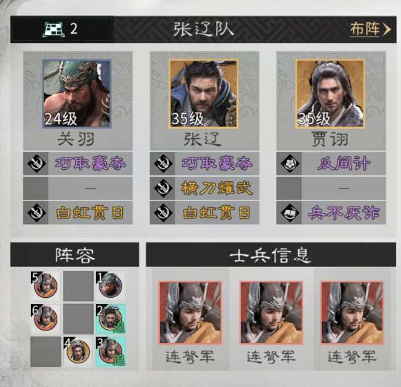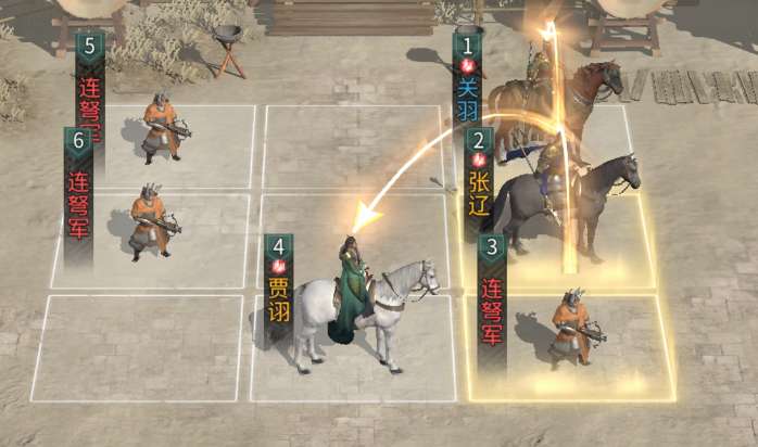 张辽站于前排中央,同时处于关羽与贾诩的追击格范围内,可额外触发追击效果,实现二次出手,打出高额爆发。