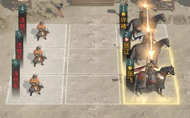 张辽位于前排中间,使其同时处于许褚、张飞的追击格上,可多次触发追击效果,实现高频率出手与爆发输出。