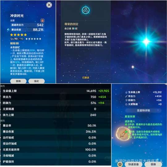 这是一个一命无专武那维莱特,圣遗物逐影猎人套,触发被动后双爆等于86%/316%。
