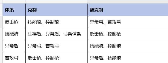举个例子,对方如果主力队是弓队,我们可以用异常盾/生存盾来抵挡伤害,兵种克制加上盾系本身的高生存,弓队是打不动的。如果敌方的前排是骑兵(例如吕布骑),我们可以选择“枪兵+弓兵”来打突破;弓兵攻击不会被阻挡,普攻覆盖范围更广,但前排一定要配置一支近战部队,否则会白给。