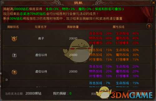 沙城捐献:玩家捐献会进行排名,排名前五可获得额外属性加成,沙城捐献2万钻石保底获得生命+3%、物防+3%、魔防+3%(保底属性可以与排名属性叠加)
