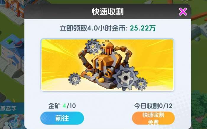 当然,金币收集器的功能并不仅有这一些,它还提供了快速收割功能,玩家们缺金币时可使用该功能快速获得一段周期内的金币产量,周期时长会随金币收集器的等级增长而增加,当金币收集器达到等级上限(30级)时,可一次性收割5小时的周期金币产量,且这种收割模式并不会影响金矿的金币产出效果,属于额外让玩家们获得更多金币。每天能进行收割的次数有限,最高为12次,且前2次可免费收割,之后若还想继续收割,则需要消耗宝钻。