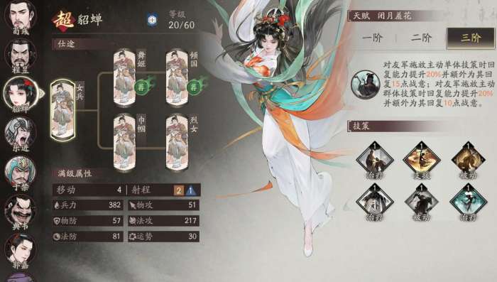 首先推荐buff类型得武将,首先是貂蝉,它的倾城技能为全队提供30%战法伤害加成,但要注意队友性别,还有一定控制能力,而且同样是全女武将触发巾帼被动的一个重要角色,任务赠送的她适合搭配全男性或全女性阵容,残血时还能提升后排5%攻速与10%损失血量回复。而曹操的乱世奸雄提供全属性+15%光环,搭配卞氏副将可提升群体攻击,亲兵系统加速升迁还能让他能快速解锁关键技能。