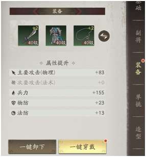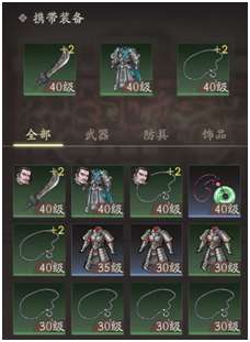 在游戏中,每位武将都可以穿戴三件装备,分为武器、防具和饰品,其中武器可以提供攻击和兵力,防具可提供兵力和双抗,而饰品则种类繁多,可以提供攻击兵力及双抗中任意两项。装备品质和等级决定了装备附加的属性多少,等级从20-60级不等,而品质则是从低到高分为:绿、蓝、紫、橙装