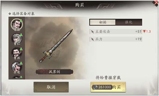 在装备购买界面可以直接选择购买并装备至指定武将身上,同时系统会自动对比购买装备与当前所穿装备属性,如果出现红色下降箭头,说明购买装备提供的属性还不如当前所穿装备,可以取消购买