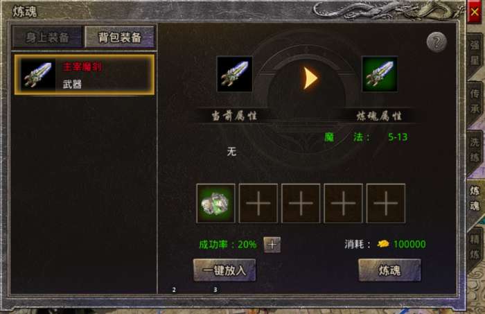 4、只使用一个炼魂材料的炼魂成功率很低,失败还会消耗所有材料,需要确保百分百成功就需要五个炼魂材料。