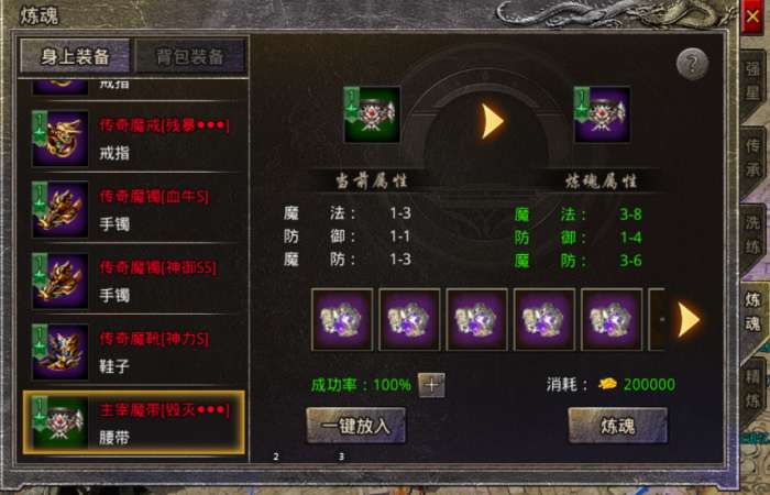 1、开服12天且角色50级以上开启炼魂功能,仅可对火龙及以上装备进行炼魂。