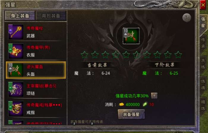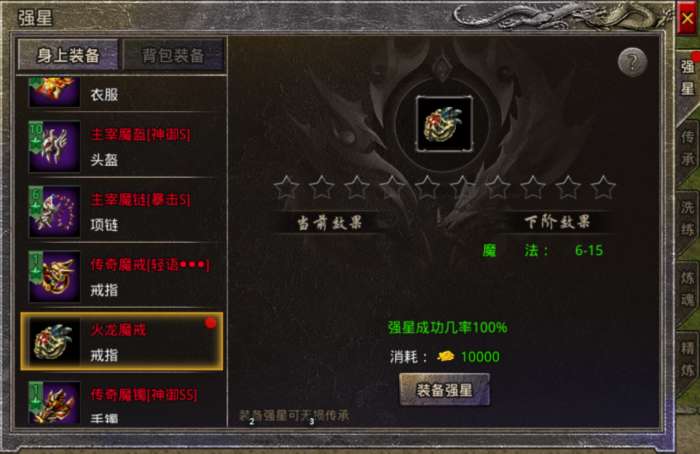1、游戏进行到中后期,当失去装备时就需要对更换的新装备重新进行强星、炼魂、精炼,这时候可以提前准备一个已经强化完成的低品质装备等到需要时进行传承。