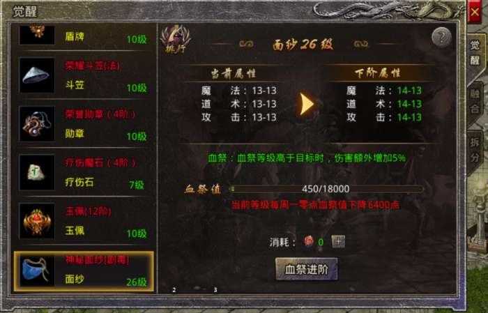 4、面纱的觉醒比较特殊,需要血祭结晶,全服面纱血祭等级排名第1、第2、第3、和4-10的角色会获得额外的5%、4%、3%、1%的血祭伤害加成。