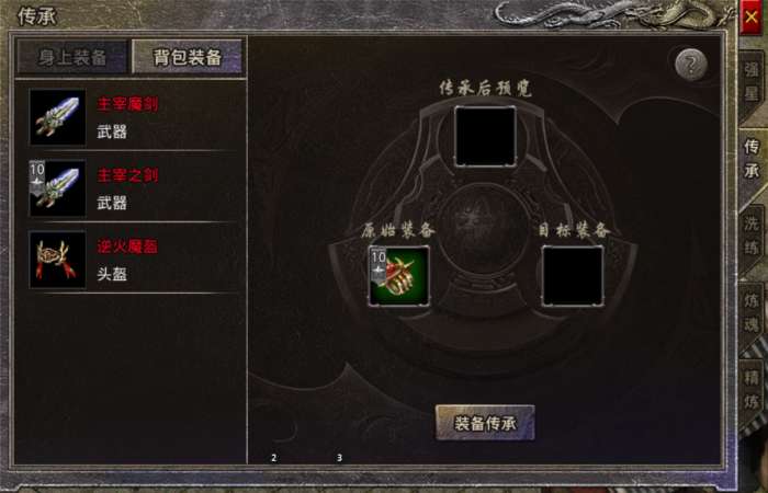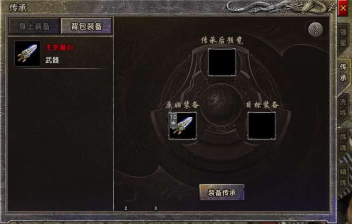 2、无论目标装备是否有强星、炼魂、精炼,传承装备的各种各种强化均会清空,所以传承需谨慎。