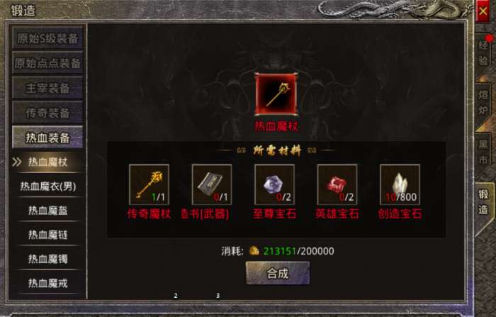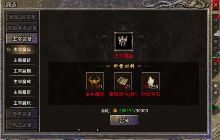 金牛级以上的首饰以及传奇级以上的武器衣服,是不可以直接通过合成界面利用创造宝石直接合成的,需要再熔炉—锻造界面消耗材料以及相应部位锻造书合成。