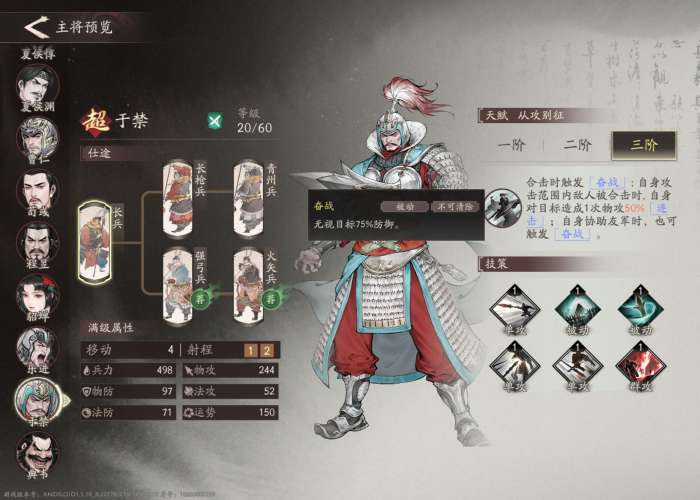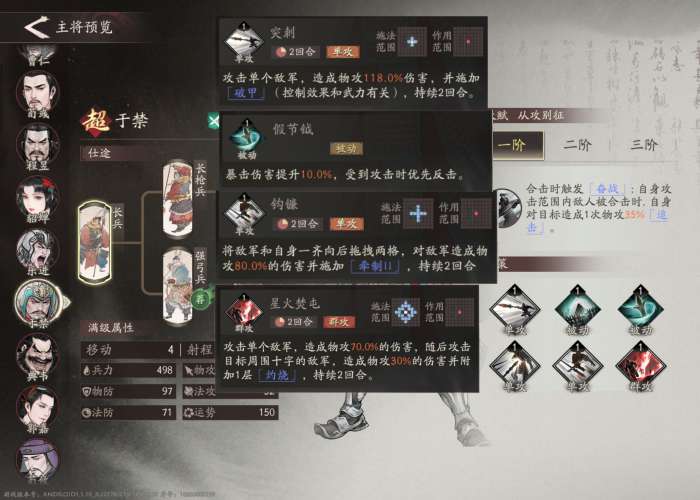 总结:左手节钺右手火,物法双修无处躲。在前期无法经常打出合击时,于禁的优势并不明显甚至比起夏侯渊来说甚至有些弱。但到后期主将丰富,操作熟练后,于禁的强度直线上升。