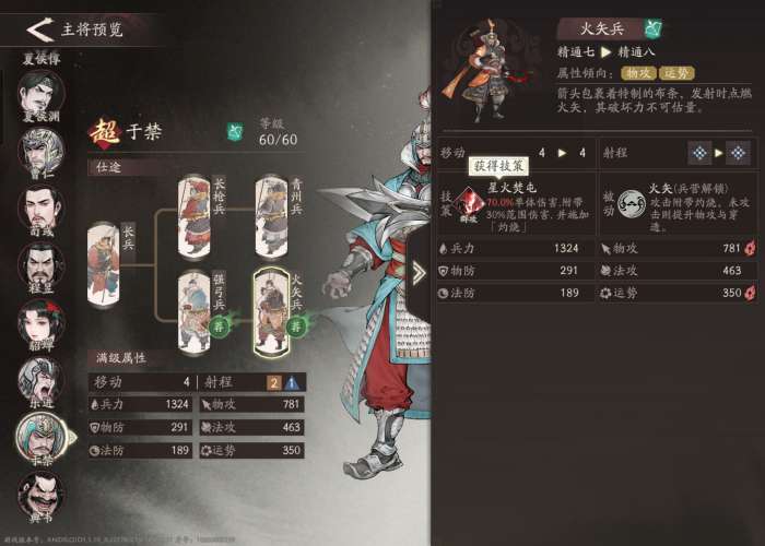 分支选择:这里推荐物法双修的火矢兵,持续法伤里除了中毒为数不多的灼烧伤害也没让人失望,附加28%的额外法伤。暴击更是达到了350,比夏侯渊的骑射手要高。