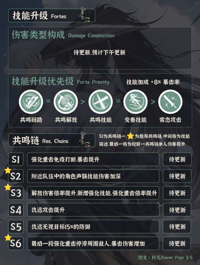 ③ 仇远主要输出类型为重击伤害和声骸技能伤害。共鸣链推荐抽取2/3/6链,2链可以增强主C的声骸技能伤害,3链大幅提升个人伤害,若想用仇远主C,建议3链。6链增加5秒控制,机制不错,可选可不选。