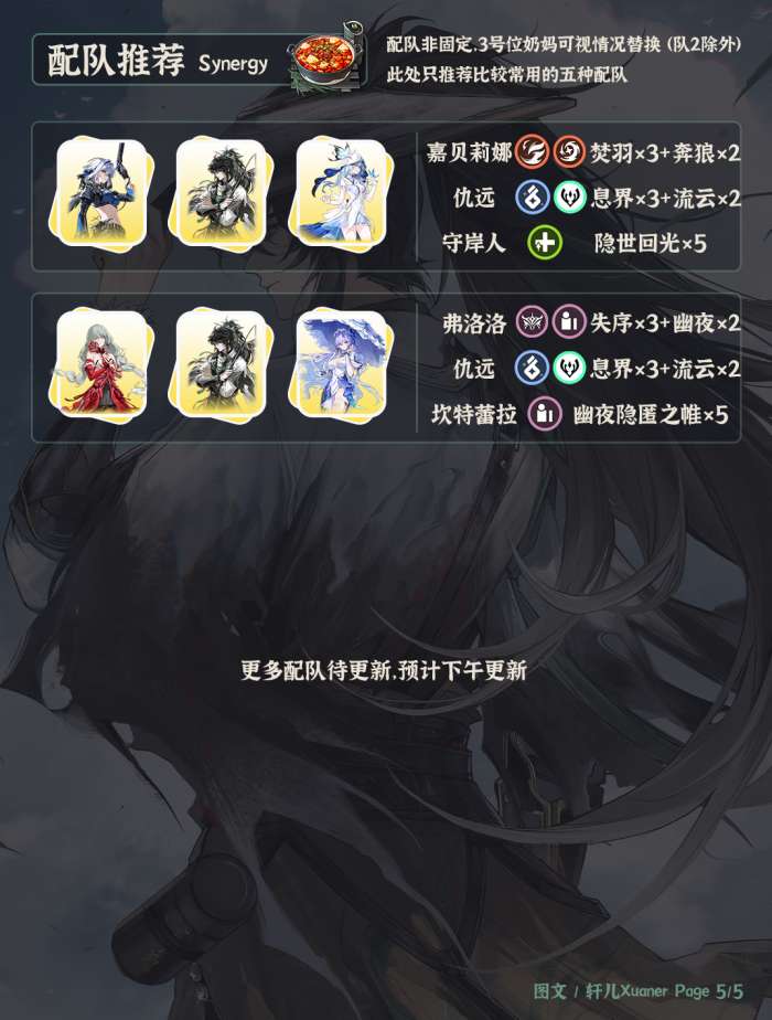 ⑤ 仇远当前主要和嘉贝莉娜组队,其次可以考虑弗洛洛队代替洛可可。其余配队待更新。