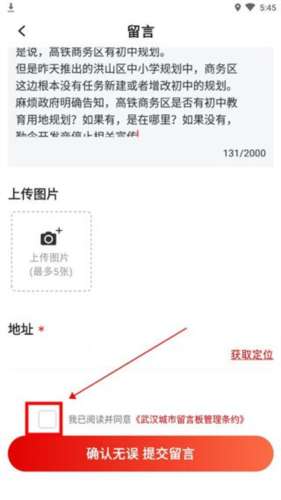 4、内容填写完后,勾选管理条约,点击【提交留言】即可。