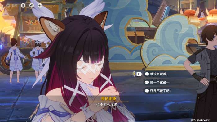 ②可更换的动物头饰,在仆人旁边的摊位处与索妮齐娅对话,有黑色猫猫耳(阿蕾奇诺同款)、棕色猫猫耳(桑多涅同款)、鹿角(菈乌玛同款)这三种款式,可以带着去和其他角色贴贴打卡喔~