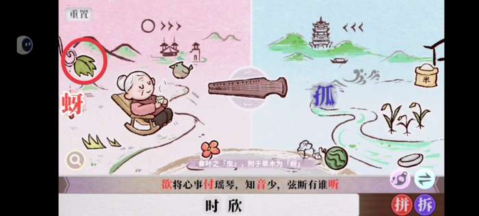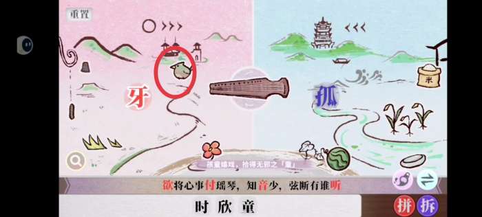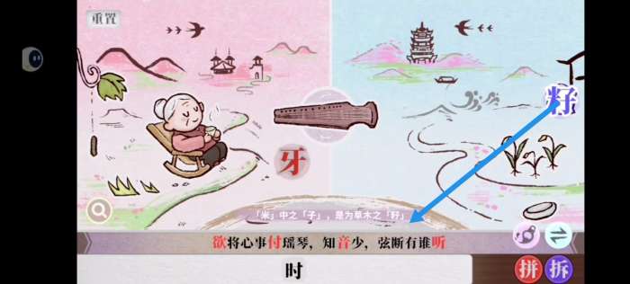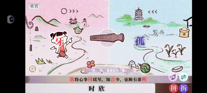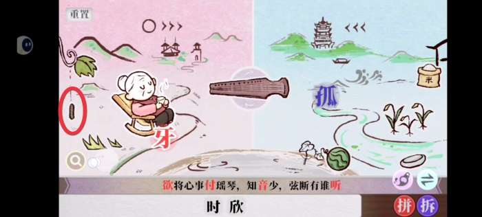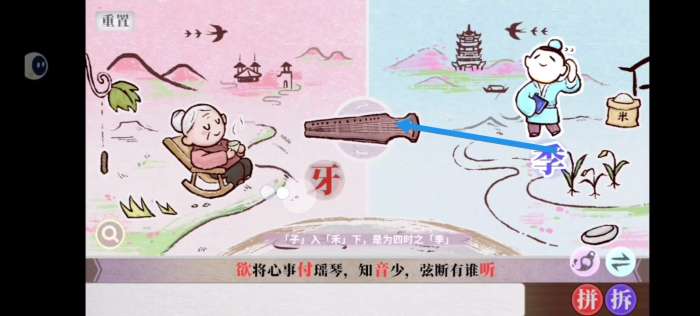 软件提交 专题合集 热门手游《字里人间》第三关需通过季节变换与场景互动获取“时”、“欣”等基础字,并拆解拼合为所需汉字。注意“籽”播种、“孤”弹琴等关键步骤,最终组合出“欲将心事付瑶琴,知音少,弦断有谁听”整句。合理利用左右人物行动与春夏交替是通关要点。