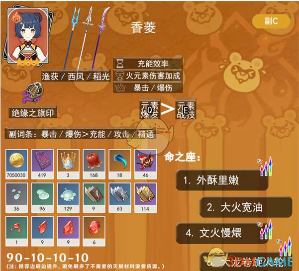 1、香菱作为深渊活动的赠送角色,其超强的后台挂火能力让她在各类阵容中都大放异彩。
