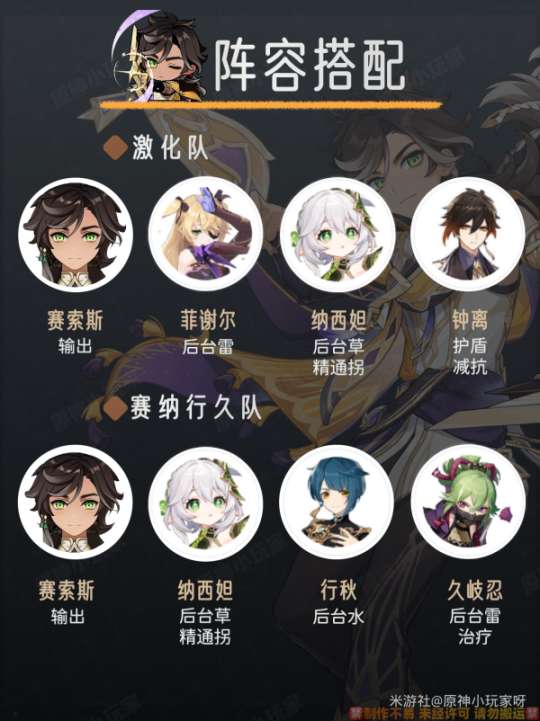 ① 激化队:赛索斯+菲谢尔+纳西妲+钟离