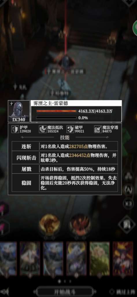 接下来就是打boss了。其实在机制方面难度不是很高,但是对于玩家们的攻击力有着非常高的要求,需要在规定的时间之内打完,如果打不掉的话就直接失败,而且有的boss带有复活效果,需要打两遍。在选择配置的时候,小编建议看一下手中有没有控制力比较强的角色,是必带的,因为虽然说boss的血条和伤害都很高,但是如果有强控角色的话,只要控制链能够连得上,那么其实boss打伤害的时间也不多。
