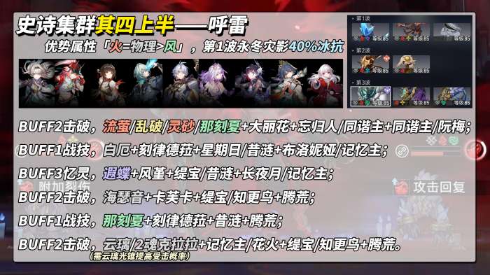优势属性「冰>量子」,外宇宙之炎40%火抗,丰饶玄鹿40%雷风抗,这三种属性输出尽量不选,对局劣势。