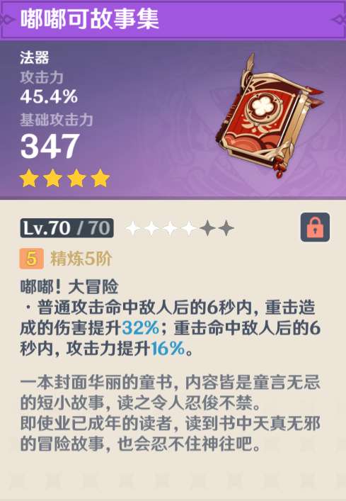 这把武器的价值并不是说有强,而是外观和背景故事与可莉太适配了,终极外观毕业武器。而且难得的是,嘟嘟可这把武器的属性,是普通攻击命中敌人后,提升重击伤害,重击命中敌人后,提升攻击力,其实对于可莉来说也挺适合的。1.6版本之后入坑的可莉玩家,真的要馋哭了。